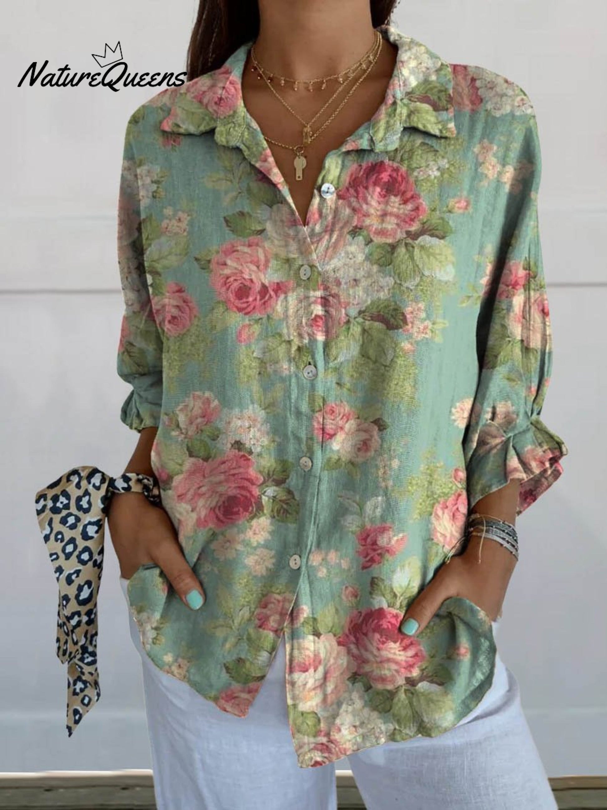 Ariela™ | Camisa de lino con cuello en V, informal, con estampado floral vintage