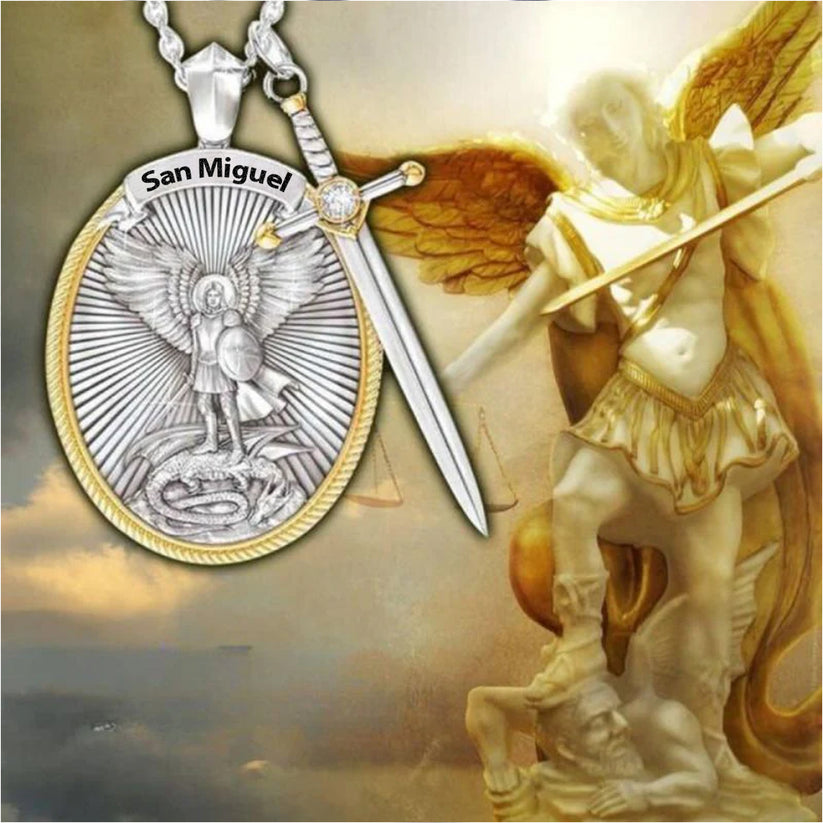 El colgante representa al Arcángel Miguel derrotando al mal .